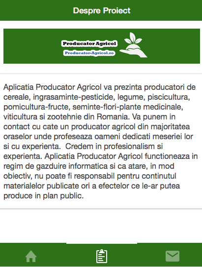 Uygulama Romanya'da tahıl, gübre, böcek ilaçları, sebze, balık, meyve, meyve, tohum, çiçek, otlar, hayvan ve hayvancılık Tarım üreticileri sunar. Biz çoğu şehirlerde bir çiftçi ile temas halinde özel insanlar kendi beceri ve deneyim pratik nerede. Biz profesyonellik ve deneyim inanıyoruz. Tarımsal Uygulama barındıran bilgisayar sistemi çalışır ve gibi, objektif, malzeme veya kamu planında oluşabilecek etkileri içeriğinden sorumlu olamaz.