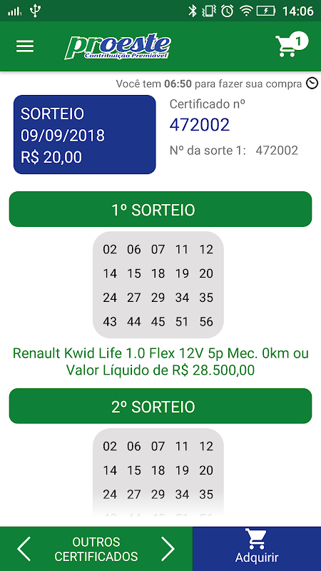6. Prêmios: Visualização do certificado vigente, a ser sorteado no próximo domingo