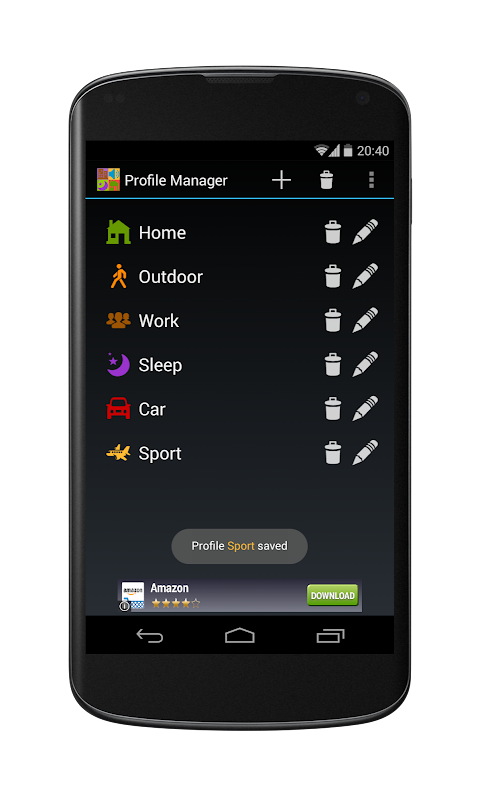 Profile Manager is an application whose goal is to allow final user to have a wide range of custom profiles and can change them as user wants in different situations. For instance, if the user is working and wants a lower ringer volume, disabled Wi-Fi and enabled mobile data, the user just create a new profile with those characteristics and set it up manually when the user is working.