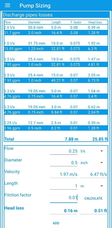 Kullanımı kolay arayüzümüzle pompanızın statik basma yüksekliğini, boru kayıplarını, bağlantı kayıplarını ve genel basma yüksekliğini hızlı ve doğru bir şekilde hesaplayabilirsiniz. Uygulamamız ayrıca sürtünme faktörünü hesaplamak için bir pencere içerir.