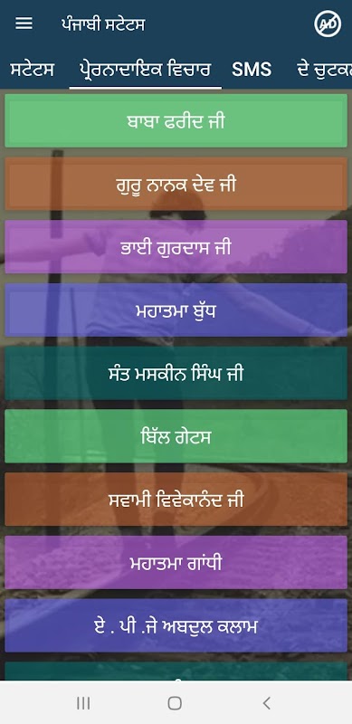 WhatsApp, Instagram veya Facebook'ta ruh halinizi ifade etmek için şık bir Pencapça Durum mu arıyorsunuz? Özenle seçilmiş Pencapça Sözler, Hüzünlü Şiir, Romantik Sözler ve saf Gurmukhi alfabesiyle yazılmış Cesur Tavır Durumları içeren en iyi uygulama olan Punjabi Status ਪੰਜਾਬੀ ਸਟੇਟਸ'yi indirin.