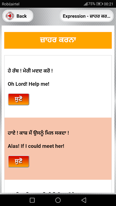 Punjabi to english is an english learning app. In this spoken english to punjabi app we have added different types of conversation so that you can learn how to speak english. We have added pronanciations of every sentences so that you can learn english pronunciation in punjabi.