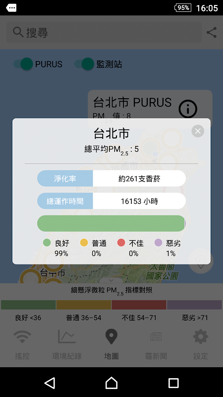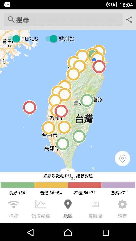 地圖:顯示各地監測站及PURUS PM2.5指數