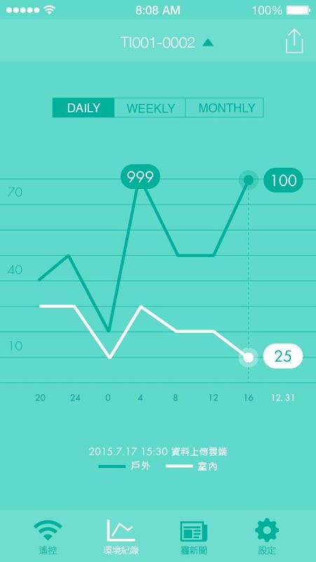 環境紀錄:顯示當下室內/室外空氣品質,並記錄長時間空氣狀況