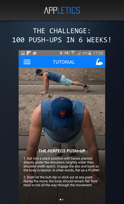 The Appletics push-ups App offers a training plan for every fitness level! Whether you already manage 10 or 50 push-ups or not even a single one - if you stick to the training schedule, you will soon be able to do 100 push-ups!