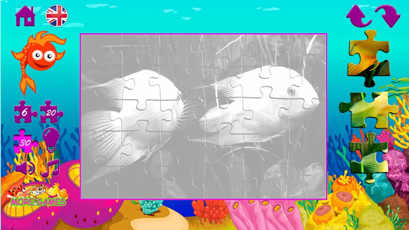 Hangimiz bulmacayı çözecek? Bu renkli bulmaca, tek bir büyük resmin küçük parçalarından oluşuyor. Bulmacalar - sizin ve çocuklarınızın keyifli vakit geçirmesini sağlayacak büyüleyici bir oyun. Bu oyunda, balıkları gösteren parlak ve renkli resimlerden oluşan balık bulmacaları yer alıyor. Balıklı çocuk bulmacaları, 6, 20 ve 30 parçaya bölünmüş resimler içeriyor. Oyunda, oyun alanının arka planında oyuncuyu harekete geçiren bir resim belirdiğinde ipuçlarını açabilirsiniz.