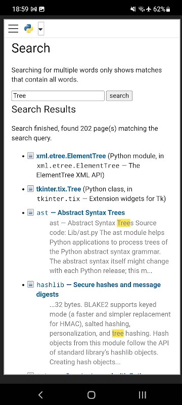 Python 3.11.1 HTML offline doc for Android OS v15 or less. Imagine Python 3.11 complete HTML offline version at your mobile device and available to all. If you have any issues, kindly contact me via email: [email protected].