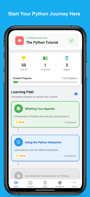 Yapılandırılmış dersler, uygulamalı alıştırmalar ve çevrimdışı IDE ile Python'u öğrenin.