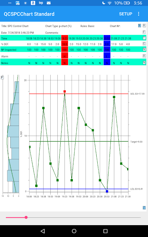 The user can customize the SPC chart and control limits using built-in setup forms. Both auto-calculated and manually set control limits are supported. The user can manually input and edit sample data from within the program. The user can also import sample data from a CSV (comma separated value) file. The entire chart setup, and data, can be saved on the host device so that they are easily accessible the next time you use the app. You can even set the current setup to be auto-loaded the next time the app starts.