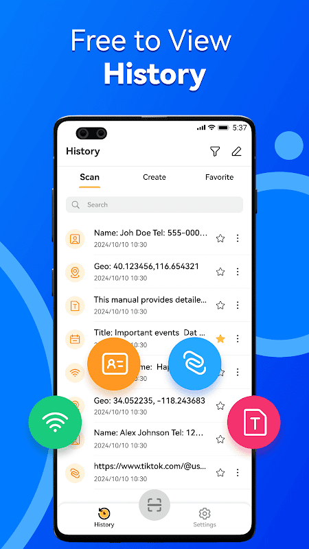 ⭐Çok yönlü tarama: QR ve Barkod Tarayıcı, metin, URL'ler, ISBN'ler, ürün bilgileri, iletişim bilgileri, takvim etkinlikleri, e-posta adresleri, coğrafi konumlar ve Wi-Fi ağ şifreleri dahil her türlü QR kodunu ve barkodu taramayı destekler. Yalnızca bir taramayla, ihtiyacınız olan bilgileri manuel giriş yapmadan hızlı bir şekilde elde edebilir, zamandan ve emekten tasarruf edebilirsiniz.