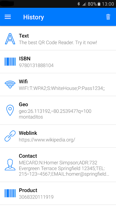 QR Code Reader; metin, url, ISBN, ürün, kişi, takvim, e-posta, yer, Wi-Fi ve diğer birçok biçim dahil olmak üzere tüm 1 boyutlu ve 2 boyutlu barkod / kare kod türlerini tarayıp okuyabilir. Okuma işleminden sonra kullanıcıya sadece kare kod veya barkod tipi için ilgili seçenekler sunulur ve kullanıcı uygun işlemi yapabilir.