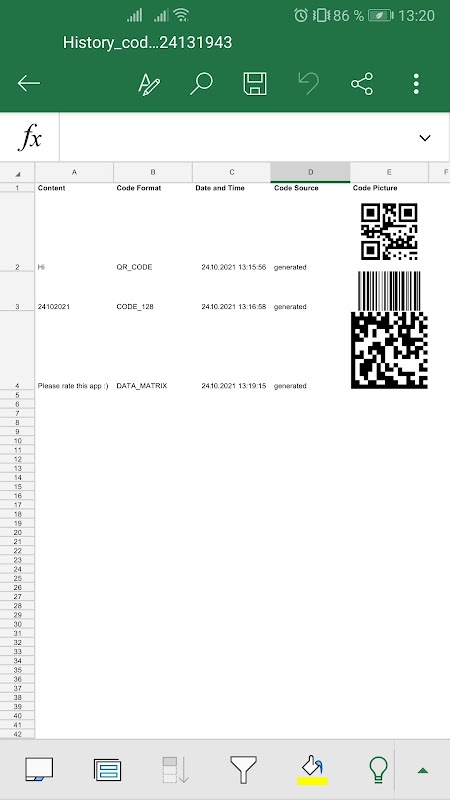 - kod resimleriyle XLS'ye aktarın.