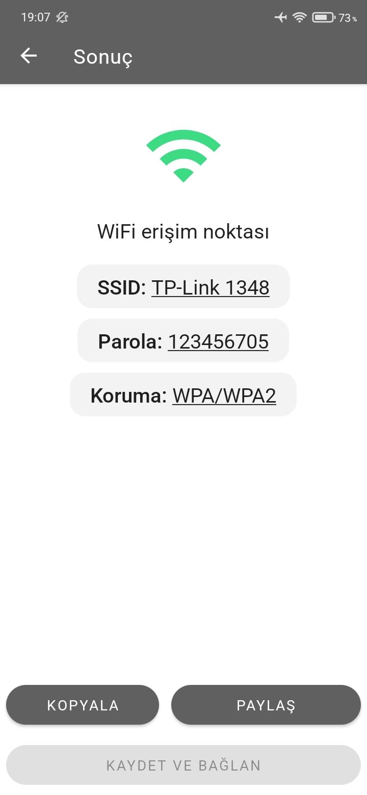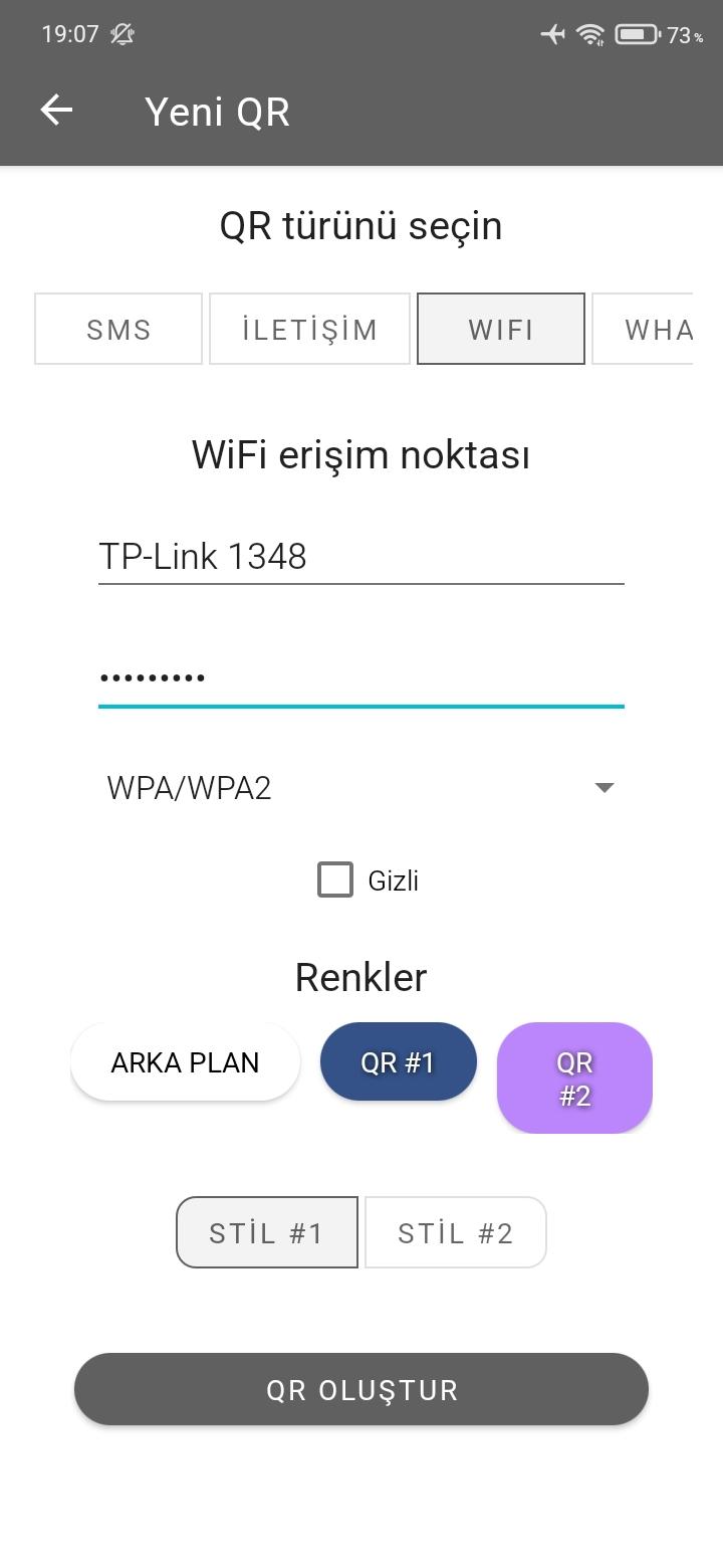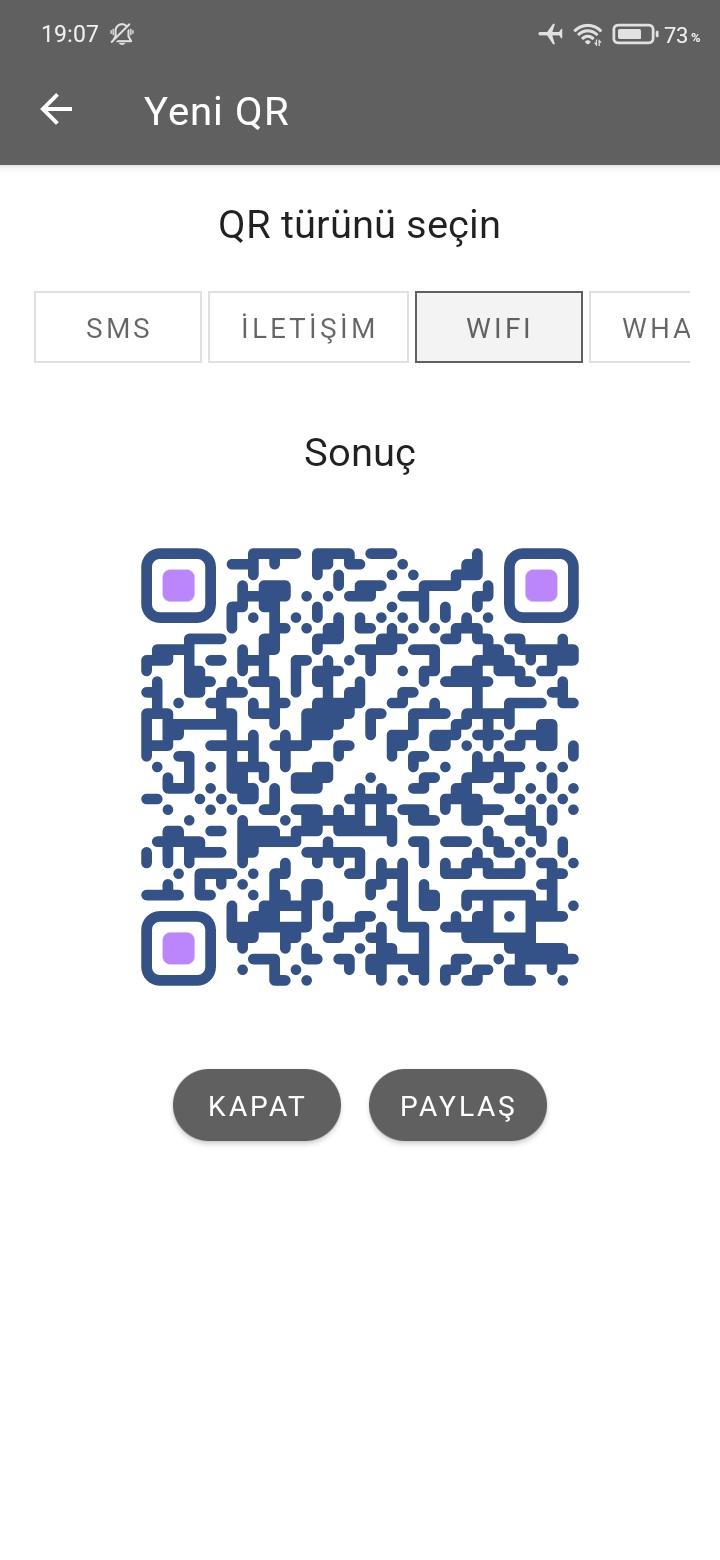 Uygulama bir QR kodu oluşturabilir. Hazır çözümlerle kendi QR'nizi oluşturmak kolaydır: Metin, URL, İletişim, Telefon görüşmesi, SMS, WiFi , WhatsApp mesajı vb. Bitmiş sonuç kısıtlama olmadan paylaşılabilir.