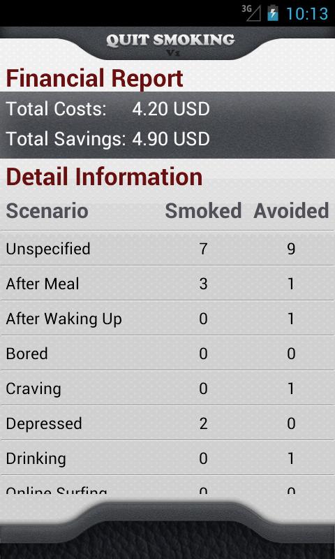 Moreover, you can see the money you have spent or saved, and cigarettes you have smoked or avoided in different smoking scenarios.