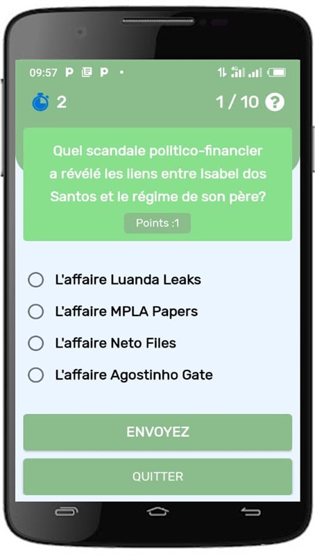 "Quiz Angola" uygulaması, kullanıcıların Angola hakkındaki bilgilerini kültür, politika, ekonomi, spor, tarih ve coğrafya olmak üzere altı farklı temaya dayalı testler aracılığıyla test etmelerini sağlayan etkileşimli bir oyundur. Oyunun başlangıcında, kullanıcı kendisini ilgilendiren bir tema seçer ve dört zorluk seviyesi sunulur: kolay, orta, zor ve uzman.