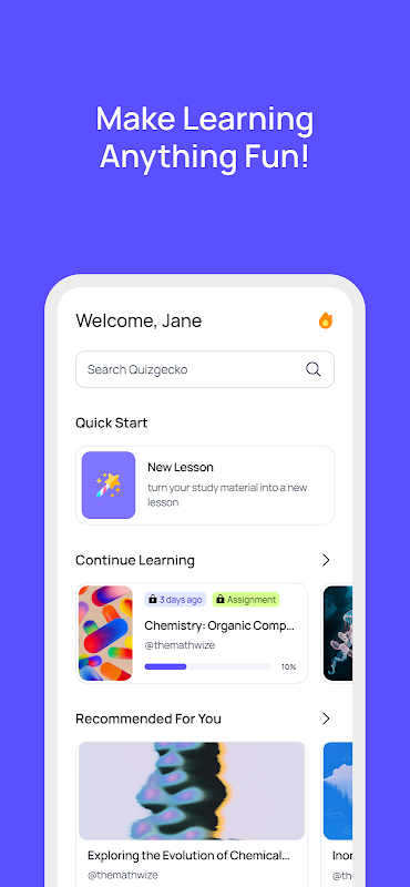 Notlarınızı artıracak bilgi kartları ve testler oluşturmanıza ve uzmanlaşmanıza yardımcı olmak için tasarlanmış, yapay zeka destekli nihai çalışma uygulaması Quizgecko'ya hoş geldiniz. İster büyük bir sınava hazırlanırken ister becerilerinizi geliştirirken, Quizgecko başarılı olmanız için ihtiyacınız olan her şeyi sunar.