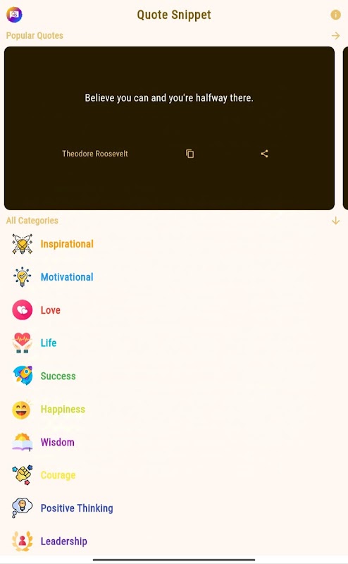 Quote Snippet, bir alıntı uygulamasından daha fazlasıdır; gittiğiniz her yere pozitifliği ve motivasyonu yaymak için tasarlanmış, kişisel bilgelik ve ilham kitaplığınızdır. Yeni alıntılar bulmayı veya ilham paylaşmayı seviyorsanız Quote Snippet sizin için mükemmel bir uygulamadır.
