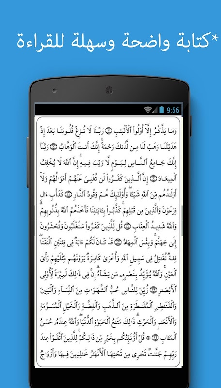 يتيح للمستخدم إمكانية قراءة القرآن على مدار اليوم فى أى مكان دون الإحتياج إلى الإتصال بالإنترنت ، عرض القرآن بطريقة واضحة ومريحة أثناء القراءة.