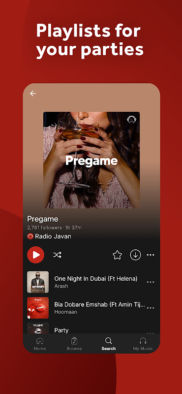 En yeni yayınları, özel içerikleri, özenle hazırlanmış çalma listelerini, DJ mikslerini ve en büyük Fars sanatçılarının müzik videolarını tek bir şık ve modern uygulamada keşfedin.
