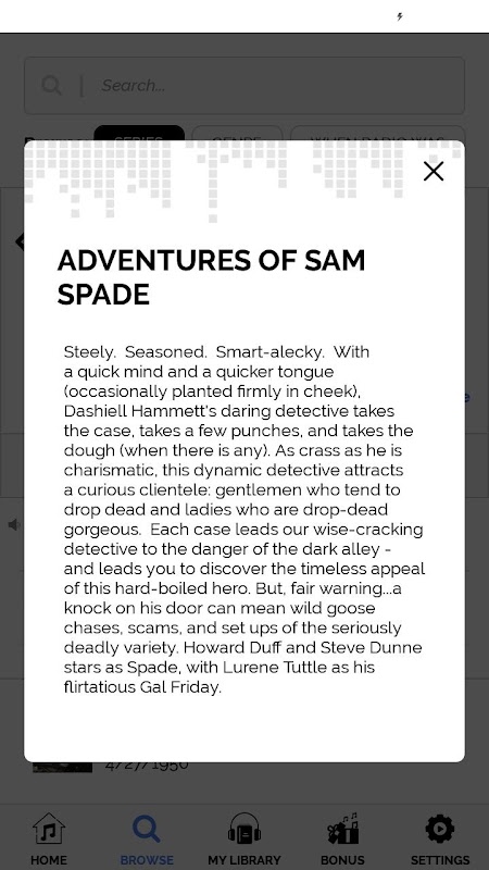 Sam Spade, Jack Benny, Johnny Dollar, Fibber McGee ve Molly, Yeşil Hornet, Riley'nin Hayatı ve diğerleri gibi harika seriler içeriyor. İsteğe bağlı bir abonelik servisi, binlerce klasik radyo programından oluşan geniş kütüphanemizden talep üzerine daha da fazla program akışı ve indirme imkanı sunar.