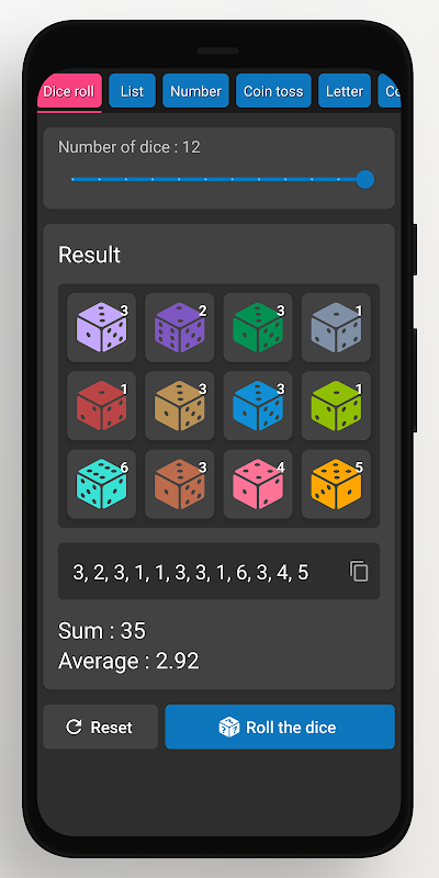 Rastgele jeneratör, zar ruloları, rastgele seçim formu listeleri, rastgele sayılar, madeni para döndürücüler, harfler, renkler, rastgele şifreler, ülkeler, tarihler ve saatler oluşturabilen basit ve kolay bir uygulamadır.