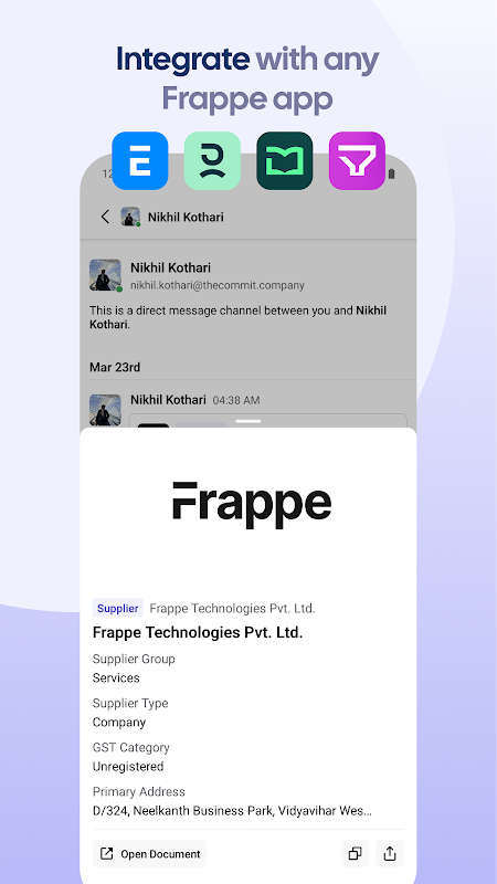 - ERPNext ile sorunsuz bir şekilde bütünleşir: Raven, diğer Frappe uygulamalarıyla zahmetsizce bütünleşerek, ERPNext'teki belgeleri özelleştirilebilir belge önizlemeleriyle paylaşmanıza, belge olaylarına dayalı bildirimleri tetiklemenize ve doğrudan sohbetler içinde iş akışları gerçekleştirmenize olanak tanır.