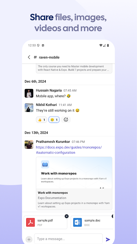 - İşbirliğini Geliştirin: Raven'da belgeleri, görüntüleri ve dosyaları paylaşın ve düzenleyin. Mesajlara emojilerle tepki verin ve konuları kullanarak organize tartışmaları sürdürün.