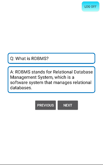Uygulama, röportajlarda rastgele ve sık sorulan RDBMS / SQL sorgularından oluşur ve böylece soruyu anlamak ve açıklamak ve röportajları basit bir şekilde cevaplamak için cevap verir.