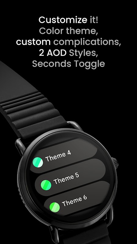 Pil dostu Wear OS saat kadranı. Birçok renk stili ve özel komplikasyonlar.