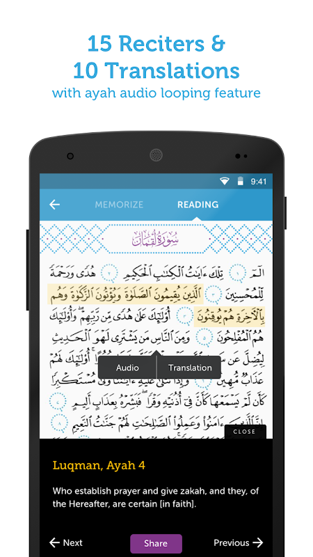 * 15 farklı ses Kuran recitations ve 10 farklı Kuran çevirileri (daha fazla çeviri yakında)