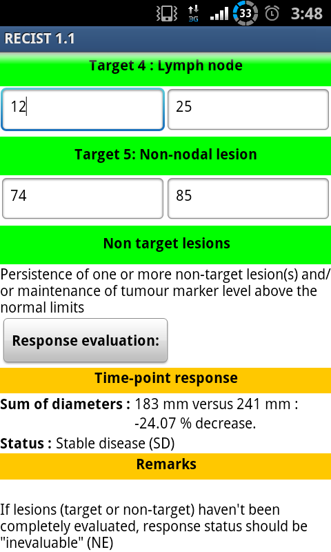It also features a calculator for sum of products of diameters which can be useful for other evaluation systems such as Cheson criteria (Lymphoma) or OMS guidelines.