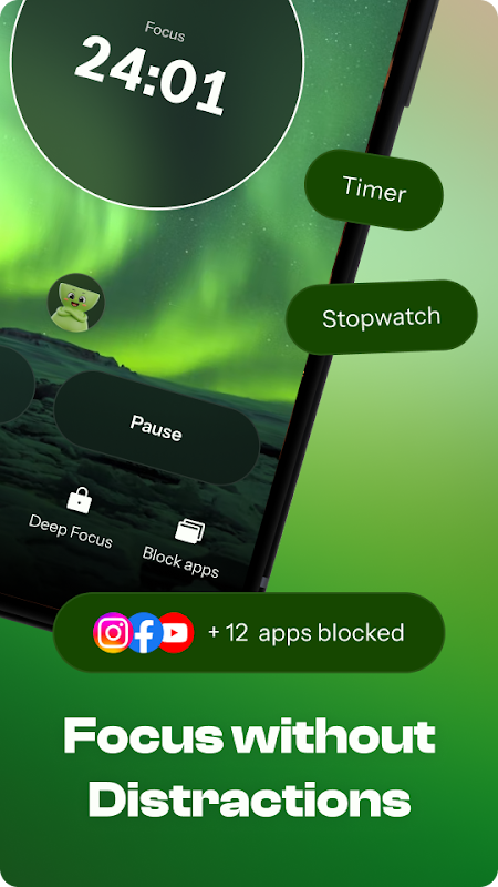 Rahatlamak için molalarla Zamanlayıcı, Kronometre ve Pomodoro modlarından birini seçin. Sakinleştirici, bilimsel temelli müzik ve premium temaların keyfini çıkarın. Erken çıkışları engellemek ve derin odaklanma sırasında ana ekranınızı gizlemek için Sıkı Modu etkinleştirin.