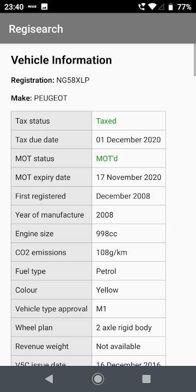 Uygulamada arama yaptığınızda DVLA ve DVSA sunucuları sorgulanır, veri döndürülürse görüntülenir. Vergi fiyatları, iade edilen araç verileri, üretim yılı, tescil yılı, CO2 emisyonları vb. tarafından belirlenir.