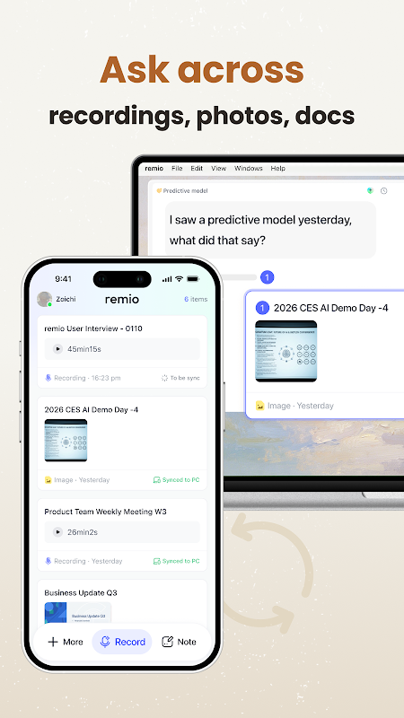 remio, toplantılar, fotoğraflar, belgeler ve notlar için eksiksiz bir yakalama ortağınızdır. Yakaladığınız her şey, güçlü yerel yapay zekâ sayesinde aranabilir ve sorgulanabilir hale gelen masaüstü uygulamanıza sorunsuz bir şekilde senkronize edilir.