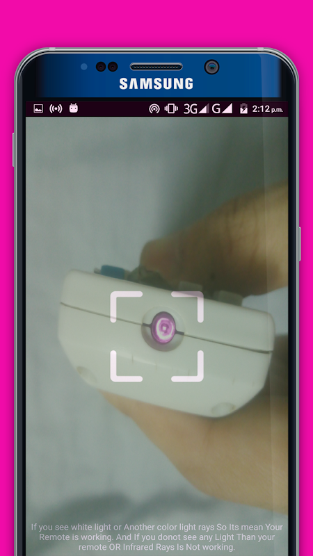 Turn on the Remote Tester app After open of the IR Remote Tester app for android. Point the end of the remote control with the Infrared transmitter Press & hold one of the Button on the remote to Test. If the remote controls is sending a signal ofIR Infarred ray, you should see a Light or white light in the of view finder cell phone or mobile screen when you press button on the Car Remote, light remote, Mp3 remote Ac Remote, laser remote Infrared Remote , Mobile remote, Tv remote, Bulb Remote, Fan Remote, IR Remote App for Android. Our app detected infrared camera which is emitted by tv remotes infra camera, and other remotes Our Remote testers and IR Remote Controlers, feature shows you white bright light, which is not visible with naked eye our special IR Infrared Camera Detection, Founder, Detected, detectors, Filter. which easily Detects Infrared rays e.g infrared remote rays, Infrared camera, Infrared lights which is not visible by naked eye