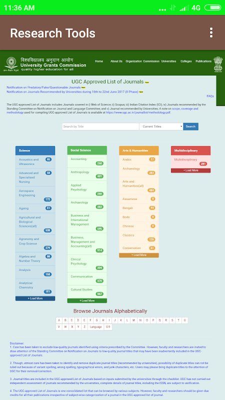 The UGC-approved List of Journals includes Journals covered in i) Web of Science; ii) Scopus; iii) Indian Citation Index (ICI); iv) Journals recommended by the Standing Committee on Notification on Journal and Language Committee; and v) Journal recommended by Universities; A note on scope, coverage and methodology used for compiling UGC-approved List of Journals.
