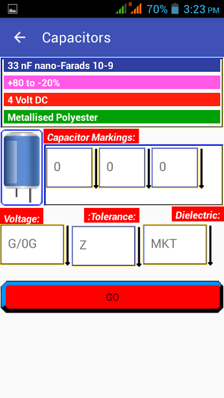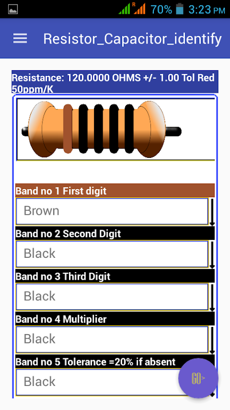 Renk coding.Resistors direncin vücudunda standart renk bantları kullanılarak tanımlanır, bir direnç üreticiye bağlı olarak 4 veya 5 bantları olabilir, bu App gruplardan direnç değerini bulmasına yardımcı olur. Bu program, mevcut uluslararası renk standardı ile uyumlu şimdi kolayca Cryptic sembollere dayanan Sığanın Değerini bulabilirsiniz, IEC 60062. Aynı şekilde Kondansatörler kendi vücudunda Semboller işaretlenmiştir olduğunu. Indüktörler veya Ezmeler aynı zamanda önde gelen bir gümüş bant ile renkli işaretlenmiştir (Direnç ayırt etmek) ve Değer ve üçüncü rakamı çarpan belirten 2 basamak.