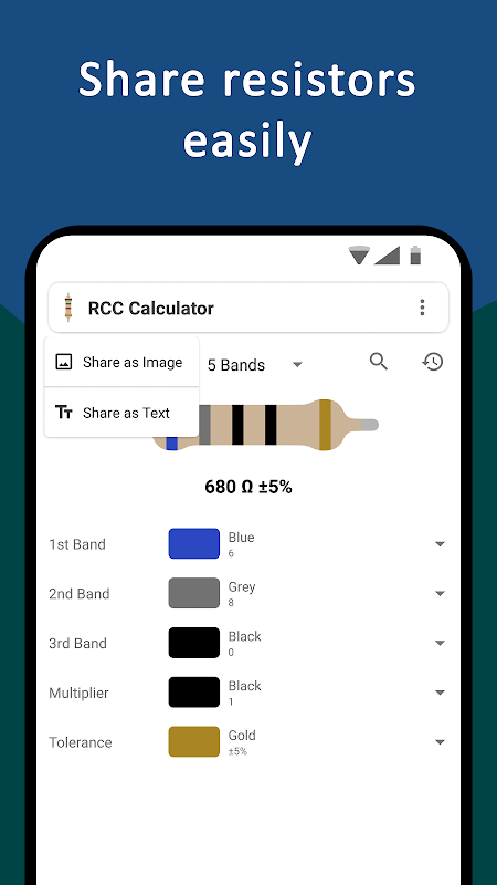 • Size mükemmel bir kullanıcı deneyimi sunmak için tasarladığımız diğer işlevlerin yanı sıra, direnç değerini diğer SI öneklerine hızlı bir şekilde dönüştürebilir ve dirençleri metin veya resim olarak paylaşabilirsiniz.