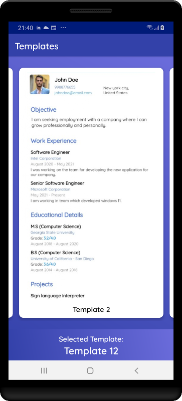 İlerleme ve teknoloji doğaçlama yaptı, öyleyse neden aynı eski yollarla bir özgeçmiş çizelim? Bir sonraki kariyer hamlenizi Resume Builder & CV maker uygulamasıyla yapabilirsiniz. Resume Builder & CV Maker - PDF Template Editor pro uygulaması, profesyonel özgeçmişinizi oluşturmanıza yardımcı olacaktır. Çünkü bu özgeçmiş oluşturma uygulaması, 2022'deki çeşitli işler için uygun en yeni şablonlara sahiptir. Kullanımı çok kolaydır ve profesyonel bir özgeçmişinizi beş dakikadan daha kısa sürede oluşturabilirsiniz. İş için bu özgeçmiş oluşturucu uygulaması, birkaç adımda PDF özgeçmiş, ön yazı ve profesyonel bir PDF CV oluşturmanıza yardımcı olur. Özgeçmiş oluşturucu uygulaması profesyoneller, yeni başlayanlar ve öğrenciler için en iyisidir.