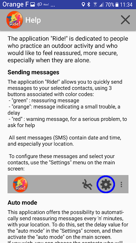 This application is dedicated to people who practice an outdoor activity (mountain biking, running, hiking, trekking, sailing, canoeing, skiing or snowboarding, etc.), sometimes alone, and who want to easily reassure their relatives or friends, warn them of a difficulty or delay, or ask them for help if a more serious problem occurs. Ride! is able to quickly send 3 levels of messages, with date, time and location. It also offers the ability to automatically send reassuring messages every 'n' minutes. In addition, a very effective fall detection function can be activated if necessary. If we add the fact that this app can be associated with the BLE 'flic button' (https://flic.io/), everything is then met to allow you a safe ride!