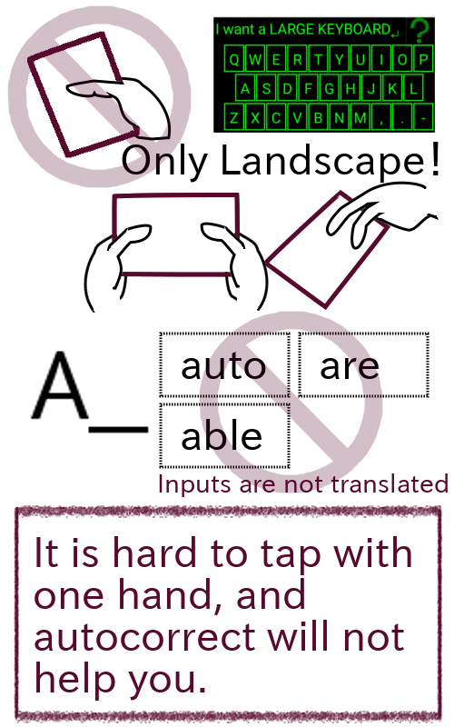 So you can not use auto-correct and learning-word functions that many Android devices serves. The keyboard is horizontally fixed, and it is difficult to tap with one hand.