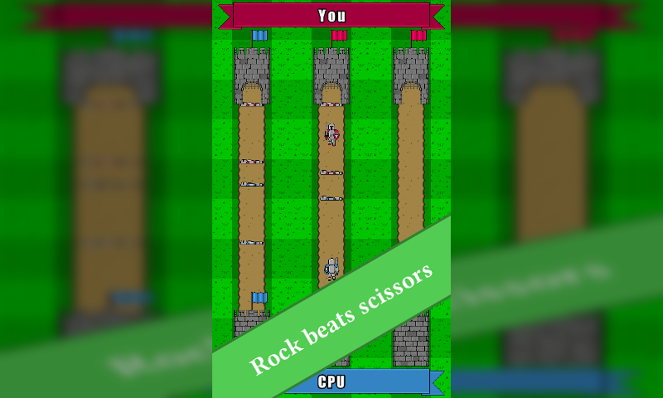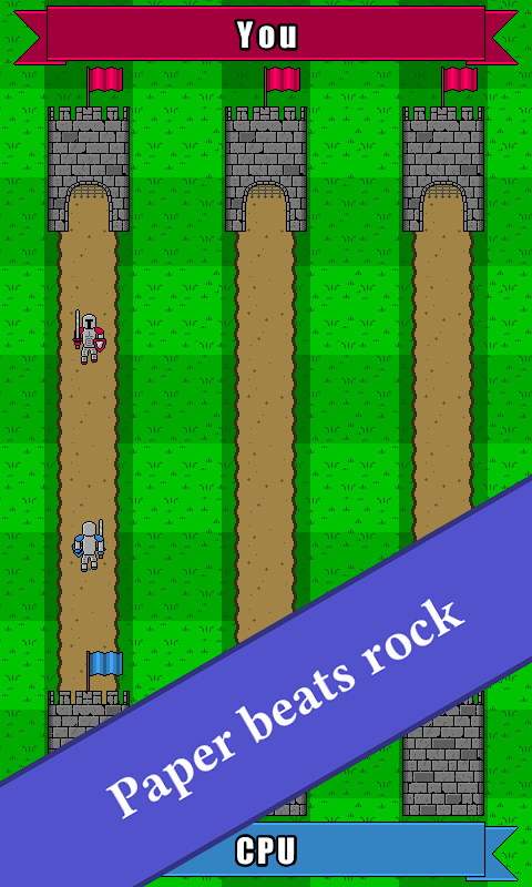 CPU'ya veya diğer oyunculara karşı çevrimiçi savaşın ve kalelerini ele geçirmeye çalışın. Her kalede taş, kağıt veya makasla donatılabilen 3 şövalye bulunur. Silahlarınızı seçin ve rakibinizi alt etmek ve kalelerini ele geçirmek için askerlerinizi gönderin!