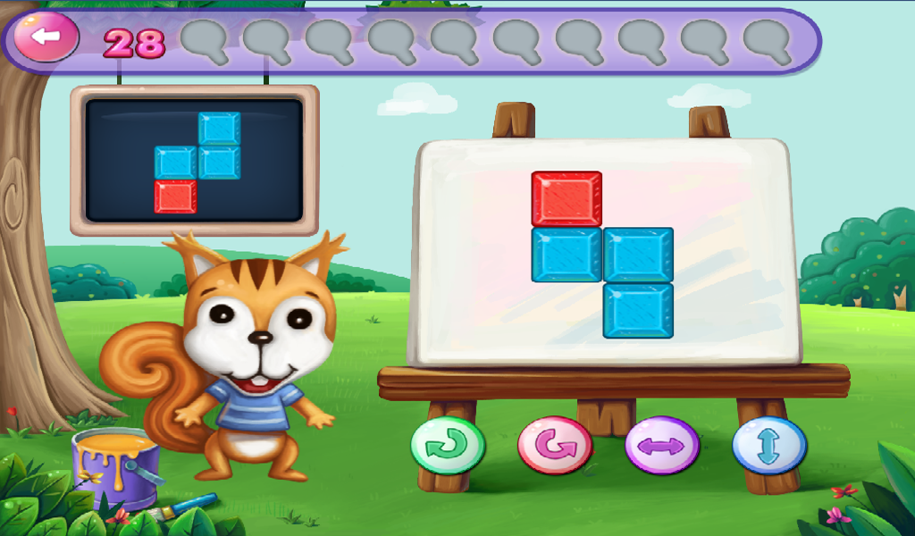 This is a test of color discrimination for children games. Players that need to rotate clockwise, counterclockwise, flip horizontal, flip vertical, exactly the same as the pattern on the drawing board and on the blackboard of.