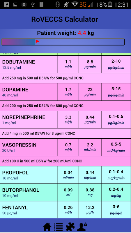 Uygulama eşlik eden hayvanlarda uzmanlaşmış pratik veteriner hekimler için tasarlanmıştır ve kullanıcıların vücut ağırlığına bağlı olarak, her hasta için acil ilaç gerekli doz uygulama hızlı ve doğru hesaplama yapmak için izin verir. Acil ilaç, terapötik bir etkiye dayalı olarak görüntülenir ve Romen ve Avrupa sağlık piyasada bulunan konsantrasyonu olarak gösterilir. Dikey sütunlar halinde sıralanır, kullanıcı elde edilen doz doğrudan mililitre (mi) görüntülenen. doz aralığı olarak ifade edilmiştir durumlarda (örn., 50-100 mg / kg), elde edilen hesaplamalar yapılır otomatik minimum doz dayanmaktadır. Bu basit ve etkili bir yazılım uygulaması 1 kg kg 1-60 arasında birimi olarak vücut kütlesini seçmek için bir imleç ile sağlanır ve böylece kritik koşullarda olan hastaların optimal tedavi uygulanmasına katkıda yeterli dozlarda güvenliğini sağlar .
