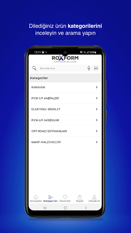 Roxform ile pikap kabinlerini, arazi ve offroad aksesuarlarını ve elektrikli bisikletleri, Doğa ve Kamp ürünleri dahil olmak üzere çeşitli ürünleri kolayca sipariş edebilirsiniz. Mobil uygulamamız ile çekme karavanlarımızı kolayca arayabilir, ulaşabilir ve sipariş verebilirsiniz. Ayrıca ürünlerimiz hakkında detaylı bilgilere ulaşabilir ve görsellerini inceleyebilirsiniz.