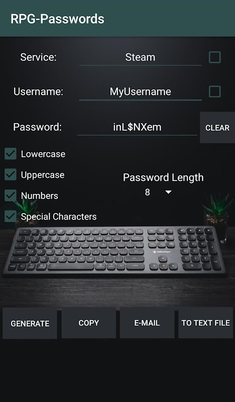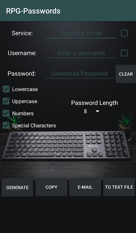 RPG-Passwords, güvenli şifreler oluşturur ve diğer verilerle yedeklemeye izin verir.