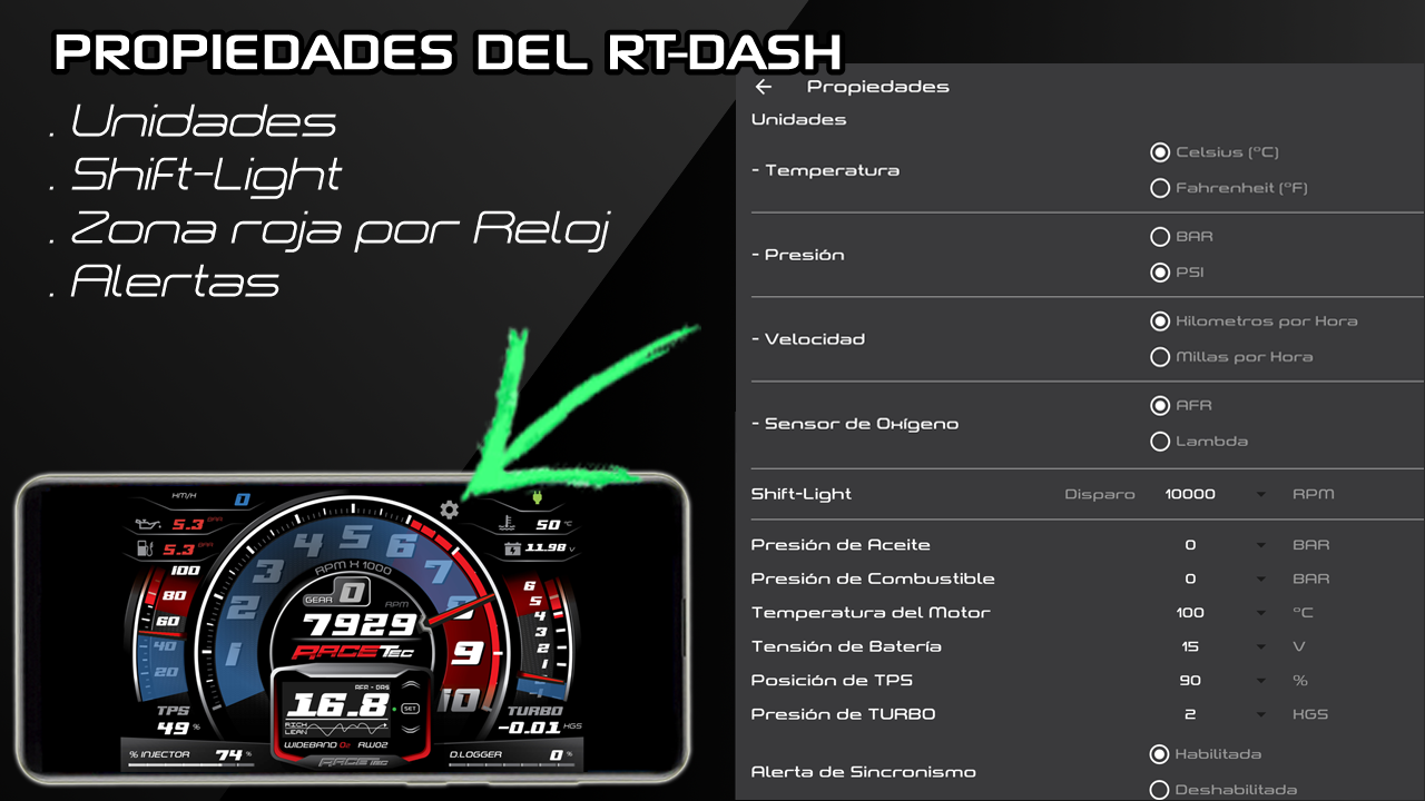 RT-Dash, RaceTec R750, R1000 ve SparkControl cihazlarıyla bağlantı kurmak için bir DashBoard veya Dashboard'dur. Devir / Dakika, O2, TPS, Turbo Basıncı, enjektörlerin yüzdesi Vb. Ayar Birimleri, Kırmızı Eşikler, Vites Işığı Devri ve Uyarılar gibi saatleri görüntüleyebileceksiniz.