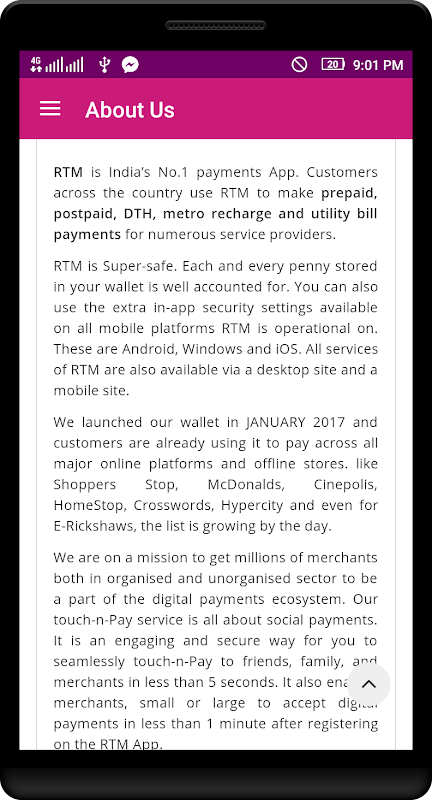 Biz dijital ödemeler ekosistemin bir parçası olmak, hem örgütlü ve örgütsüz sektörde tüccarların milyonlarca almak için bir misyonu vardır. Bizim dokunmatik n-Pay hizmeti tüm sosyal ödemeler hakkında olduğunu. Bu sorunsuz dokunmatik-n-Öde az 5 saniye içinde arkadaşlarınız, aileniz ve tüccarlara için ilgi çekici ve güvenli bir yoldur. Aynı zamanda, küçük veya büyük tüccarlar, RTM App kaydettikten sonra 1 dakikadan az dijital ödemeleri kabul etmenizi sağlar.