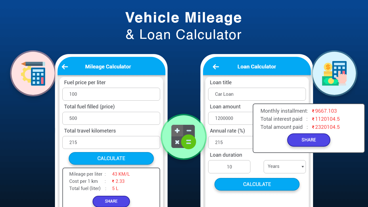 Bu RTO araç bilgileri uygulaması, aracın yeniden satış değerini, parça hız göstergesini, aylık araç gider yöneticisini, Kilometre hesaplayıcısını ve kredi hesaplayıcısını hesaplamak için bir hesap makinesi seçeneği sunar.