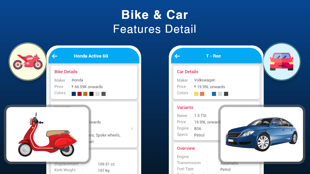 Araç bilgileri uygulaması, fiyat, özellikler, spesifikasyonlar ve çok daha fazlası gibi yararlı araba ve bisiklet ayrıntıları sağlar.